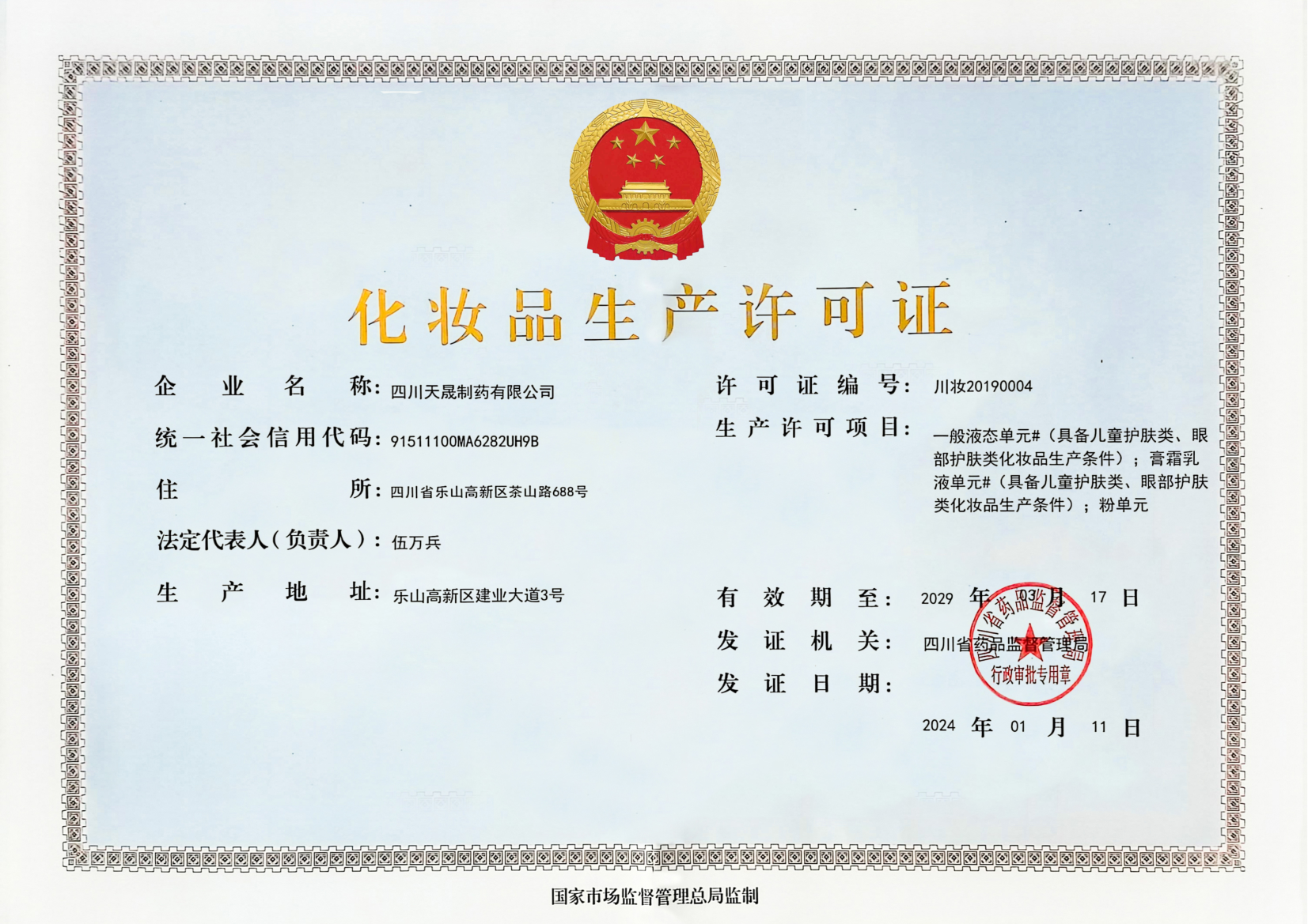 四川天晟成立于2015年,隶属于晟氏健康公司,位于四川省乐山国家高新技术产业开发区,是一家集自主研发与生产的中成药品和院内制剂、医美级化妆品和洗化产品、消字号产品、功能营养食品和保健食品的国家高新技术企业。